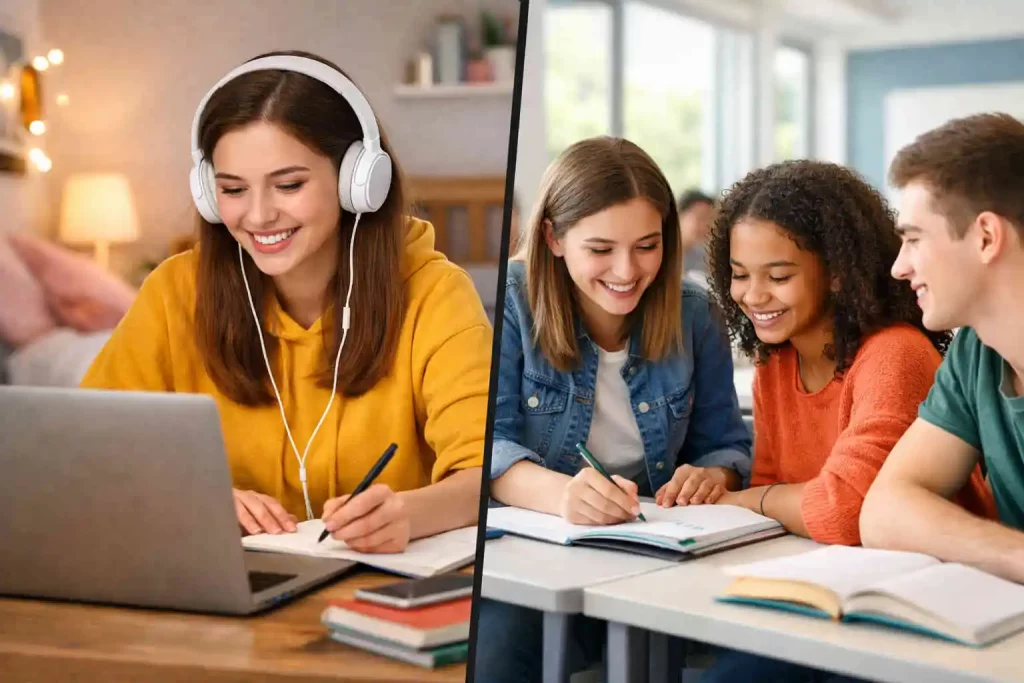 Isso significa que você não precisa escolher entre um ou outro. O Ensino Híbrido, você aproveita a interação social do presencial e a autonomia das ferramentas online para aprender de verdade.