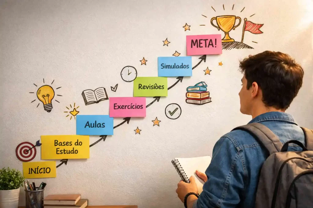 Com um plano adequado, você consegue priorizar conteúdos, organizar seu tempo e traçar metas que realmente importam. Dessa forma, o aprendizado se torna mais produtivo e direcionado, evitando esforços desnecessários e cansaço mental.